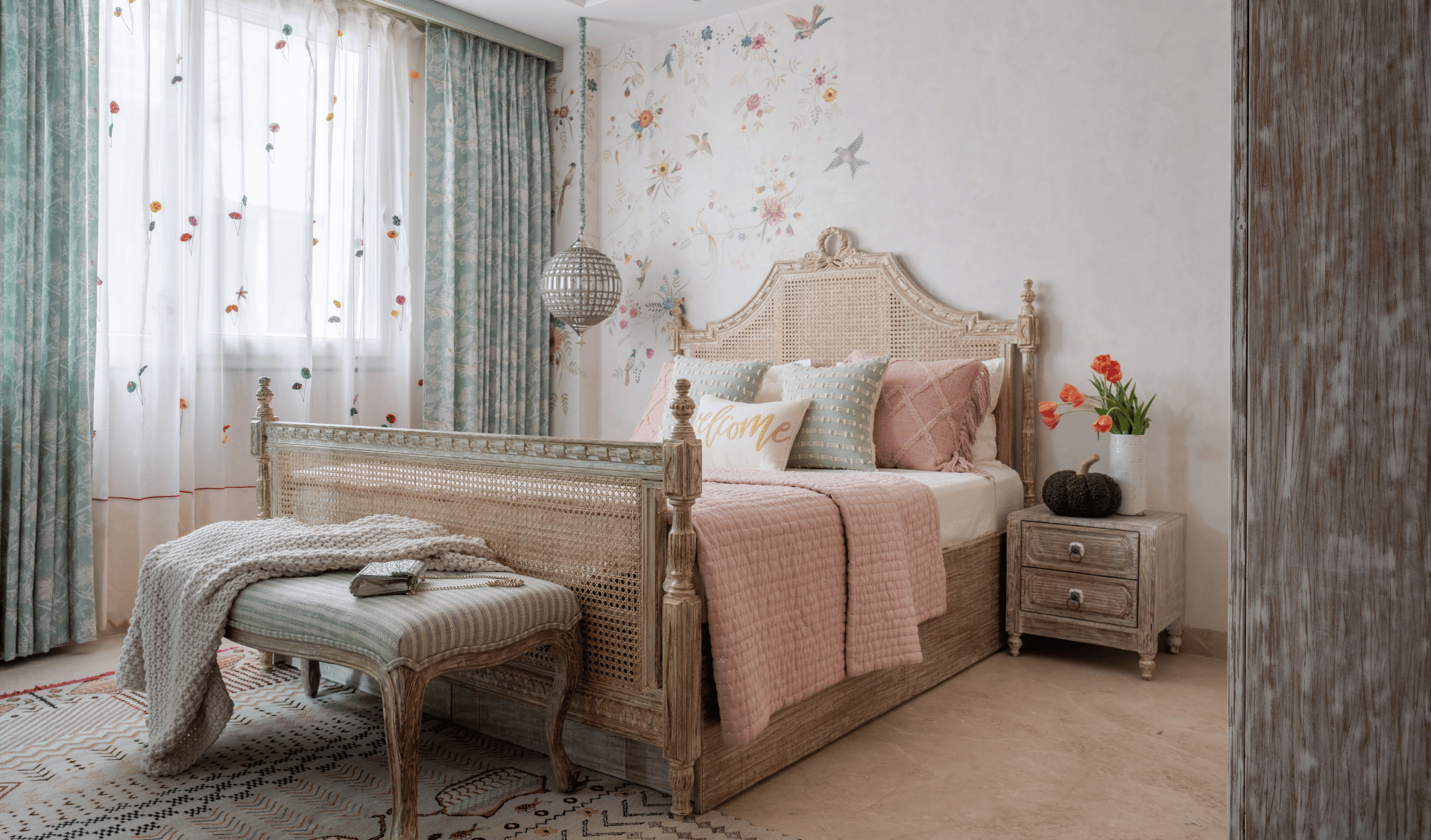 There’s a sensuous feel to the whole space, she even extended that concept to the furnishings -Cane, Leather and solid upholstery runs throughout the house. While travelling to Kashmir clientsloved wooden carving so much so that they bought their bed from a Kashmiri vendor - In the Masterbedroom, the Four poster bed is made from the traditional walnut wood of Kashmir and usedKashmiri local manpower to hand carved the bed. Using cane on the wardrobe shutters, fabricsandwiched between two glasses was to recreate the old memories of when they were young andused to stay in their respective hometown.