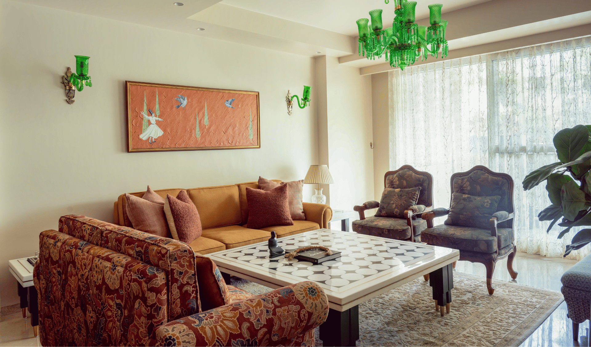 “I feel home is where the heart is” said Kissa. While designing the house they were inspired by surrounding nature and wanted to bring the outside- inside. The large window floods the living room with natural light and leads you to a riot of lush green filled balcony. The soulful colour anchors the space while witnessing a-lot of colour-play, artwork and materiality inspired from nature. The grandeur of the house unifies with majestic chandeliers, beautiful marble flooring, a mix of refined yet approachable pieces clad in distressed wood to soften the sense of formality –offset by more casual touches across the space.