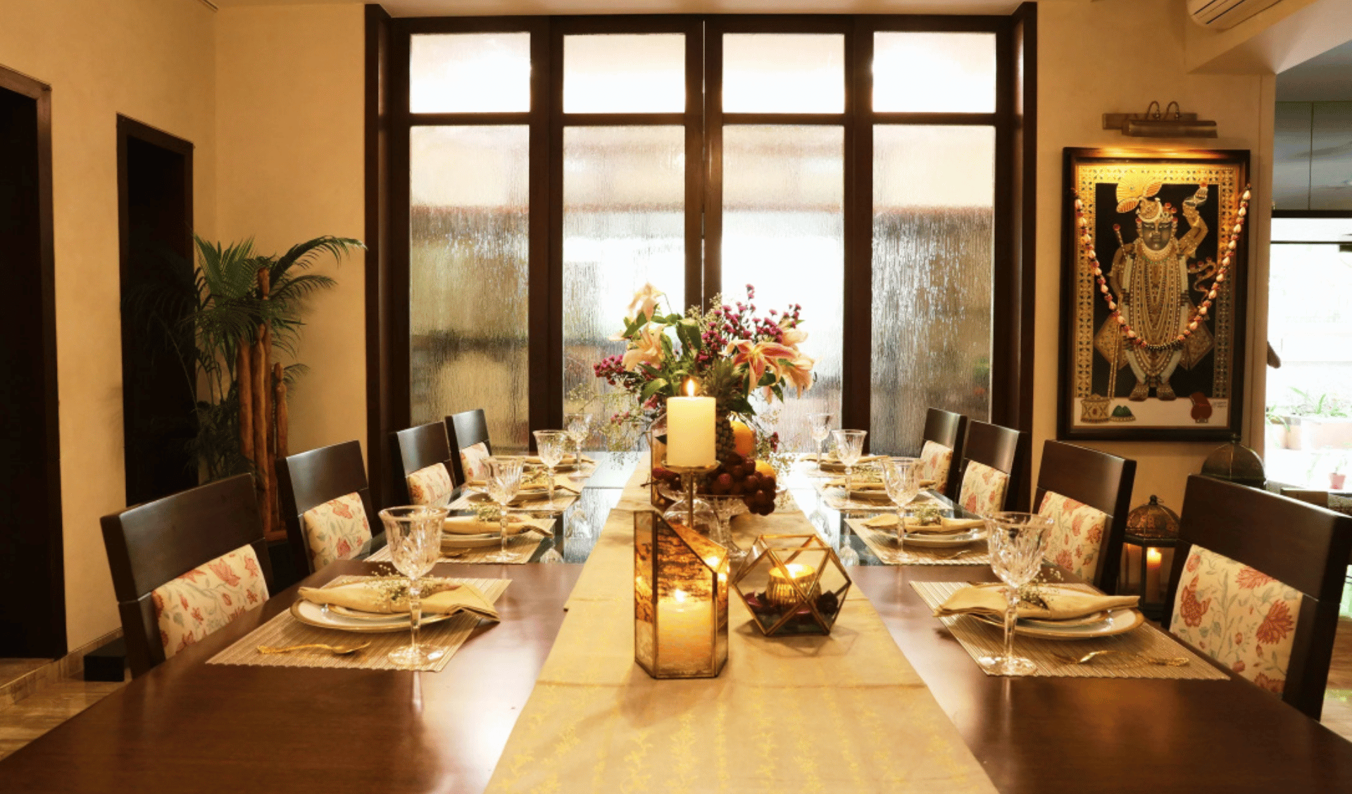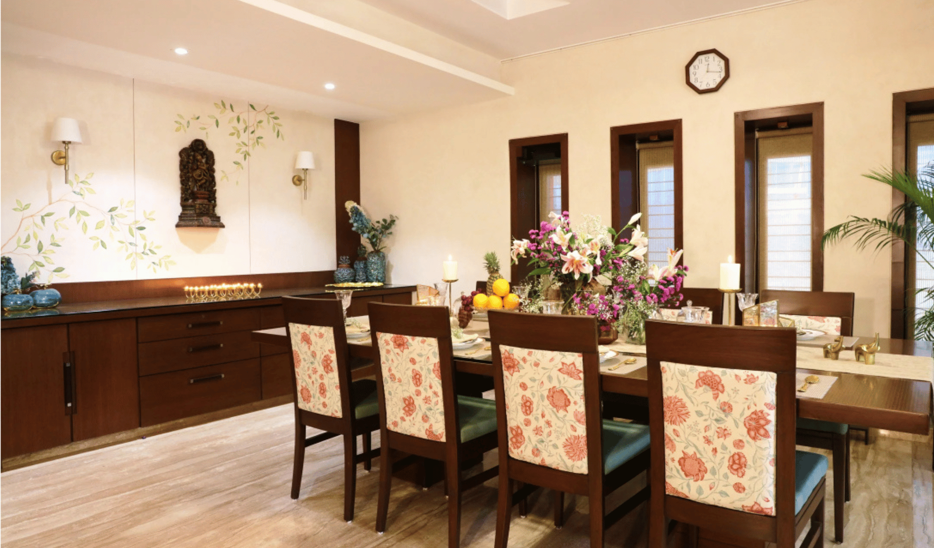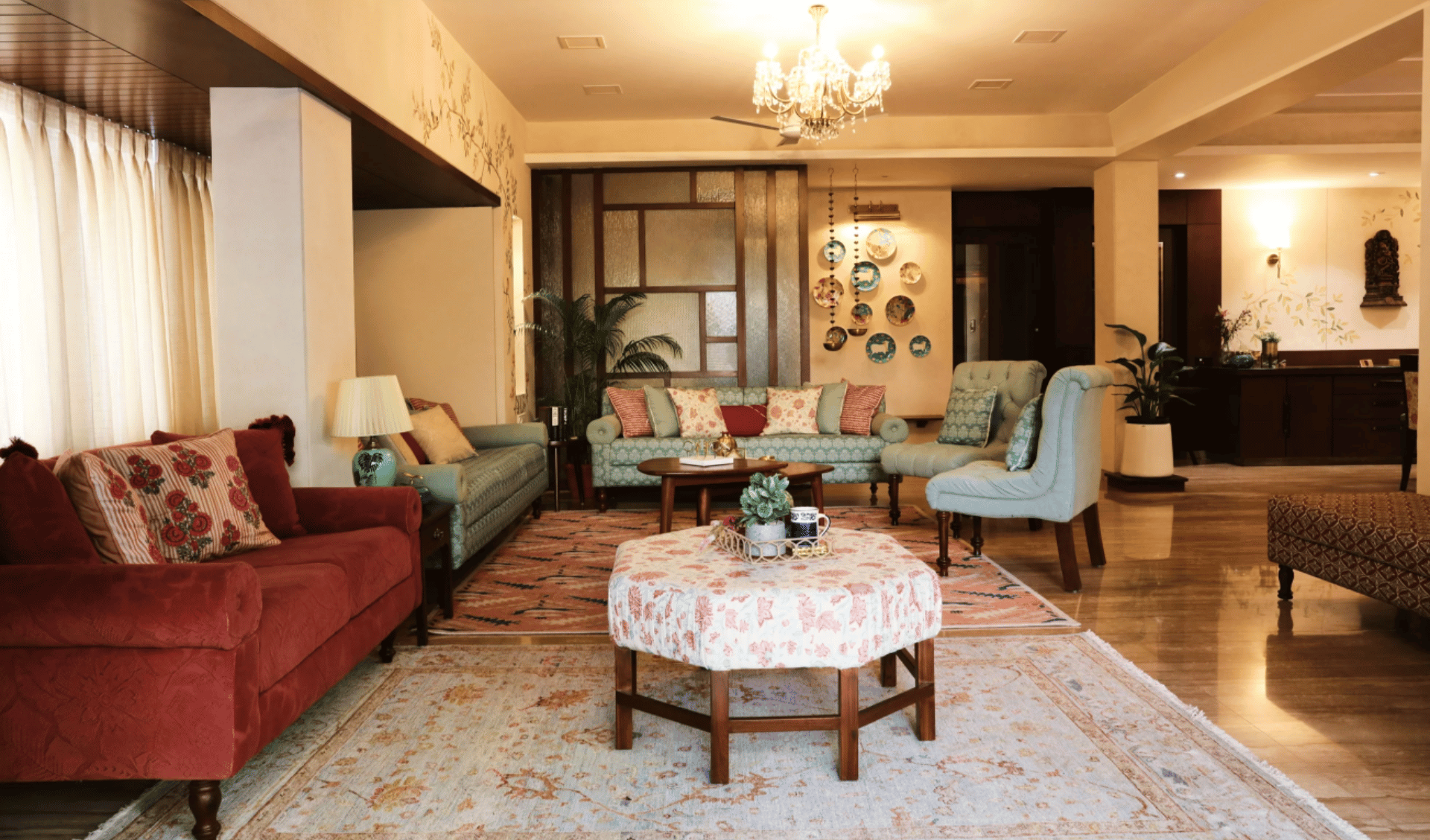 Bathed in abundant natural light from the expansive windows, the design language blends Indian aesthetics with contemporary elements, brought to life through a thoughtful mix of printed and solid fabrics. The muted wall tones create a calm backdrop, accentuated by hand-painted, nature-inspired artwork that adds a soothing, organic charm to the home.