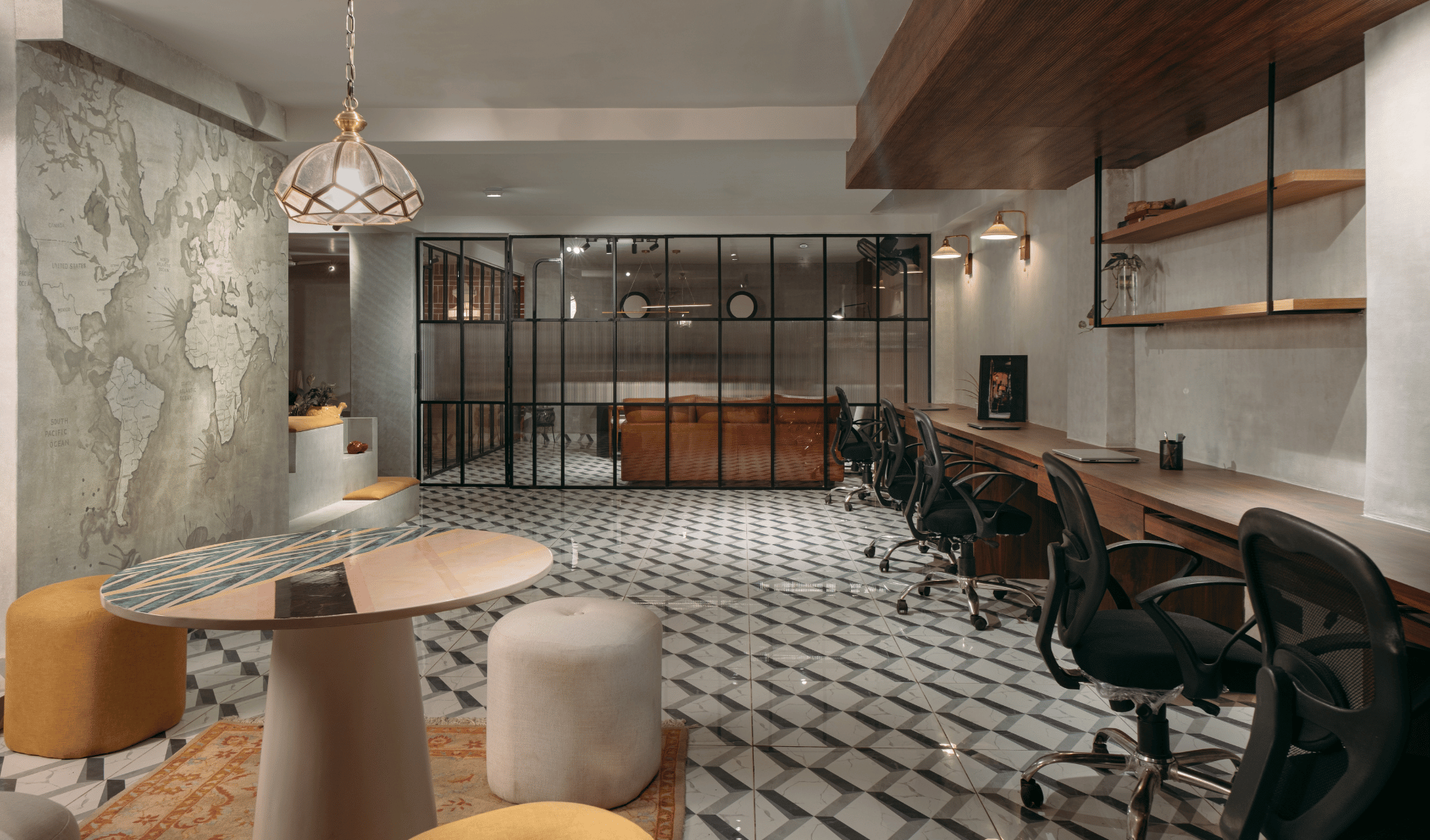 The conventional workstation has been given a modern twist with printed and patterned flooring and tabletops in natural wooden polish. A hand-painted world map adds a dramatic element while subtly reflecting the company’s ideologies and work ethos. The overall design language is minimalist, choreographed to inspire creativity, collaboration, and unconventional thinking.