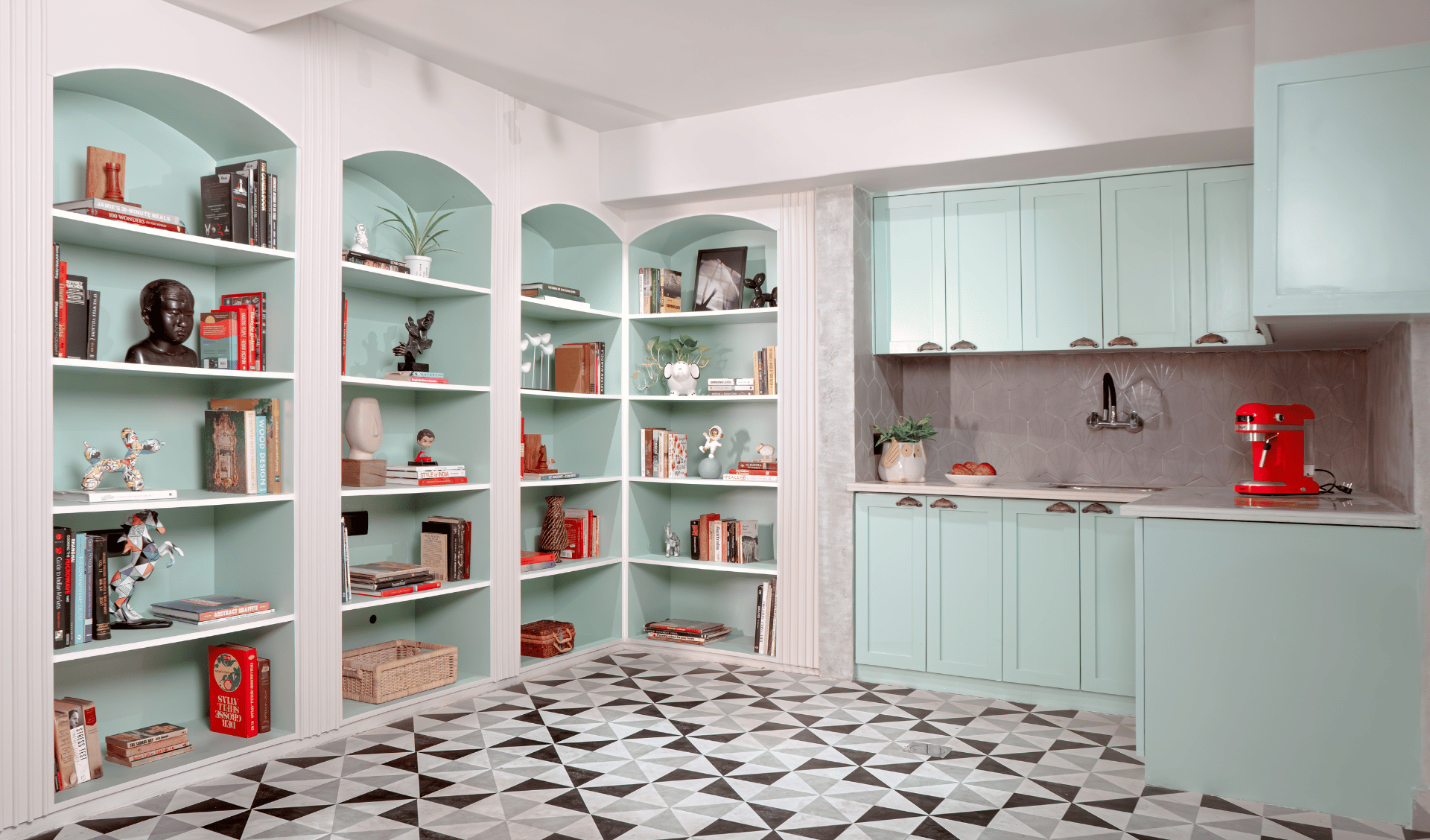 A standout feature of the space is the white and teal arched library unit, complemented by a small utility pantry counter—details that infuse a homely ambiance and add a dramatic punch to the office. The cabin exudes elegance and timeless charm through veneer paneling and a minimalistic design approach. Metal frameworks with fluted glass divide the cabin, ensuring both privacy and transparency.