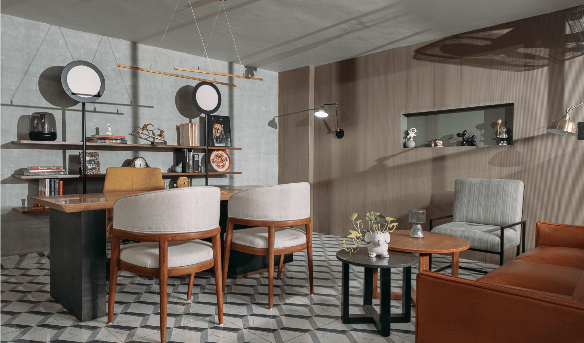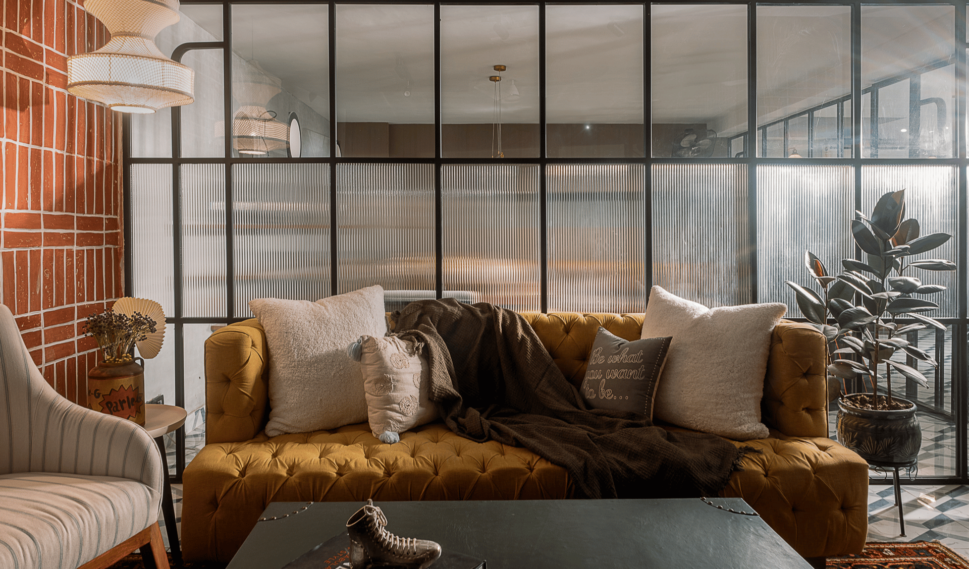 Nested in the heart of Nizamuddin West, the Artistry Office spans 1,100 sq. ft. and serves as the brand’s head office. When the client requested a casual and non-office design, TST responded with an unconventional palette featuring popping yellow upholstery, warm wooden polish, grey textures, fluted glass, and an open layout. The goal was to create a space that feels airy, open, and more akin to a chill, creative environment than a conventional workplace.